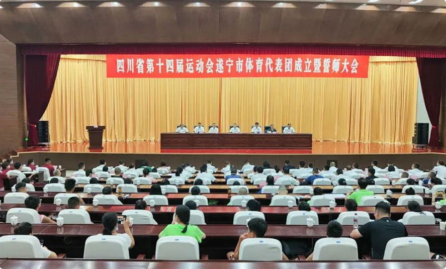 7月13日,四川省第十四届运动会遂宁市体育代表团成立暨誓师大会在市环岛商务中心召开。市委常委、组织部部长张鹏飞为代表团授旗并作动员讲话,副市长张智勇主持会议。