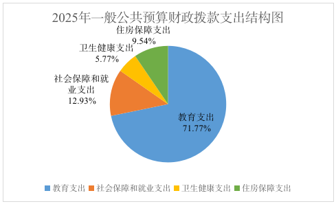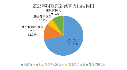 教育支出4275.59万元,占71.77%;社会保障和就业支出770.14万元,占12.93%;卫生健康支出343.83万元,占5.77%;住房保障支出568.20万元,占9.54%;